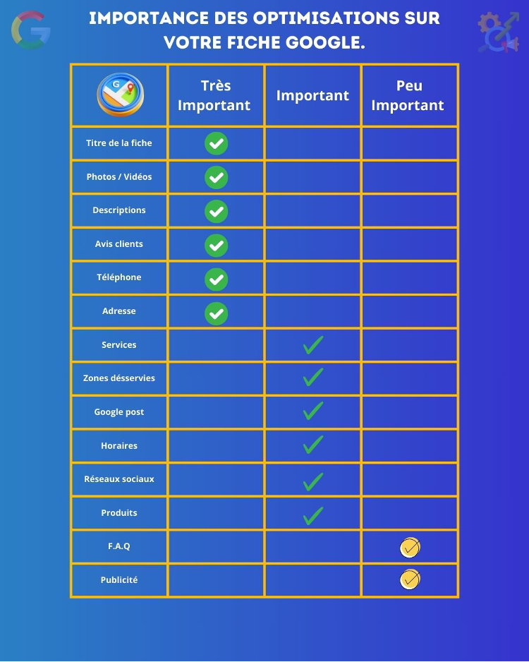 Voici une infographie pour reprendre différents points à optimiser avec leur importance :
